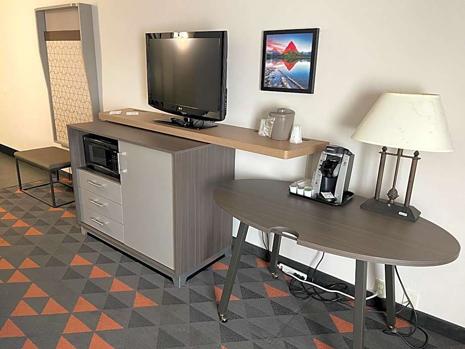 This spacious room features a 32-inch flat-screen TV, microwave and mini-fridge.